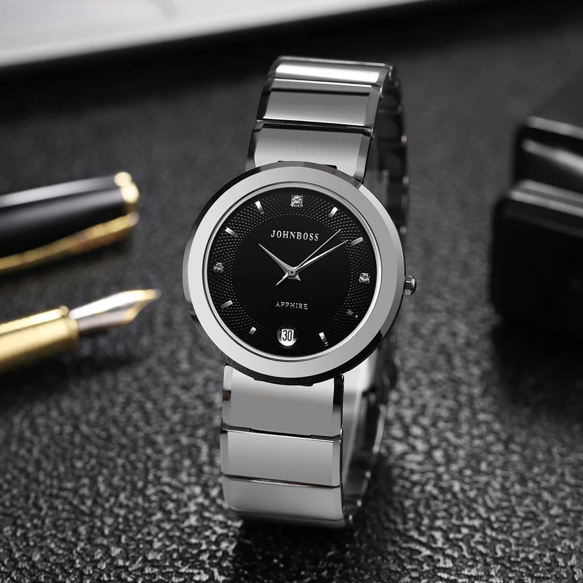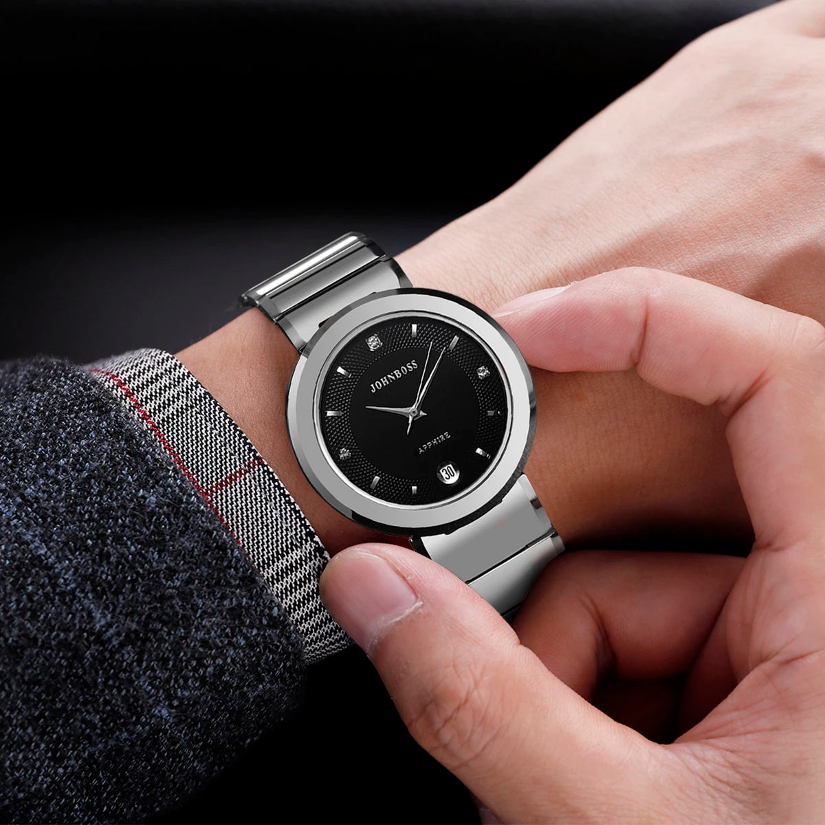 The RBB Men's Simple Quartz Watch offers minimalist elegance with exceptional durability. Designed with a slim tungsten steel case and band, this round dial timepiece features a numberless analog display, complete calendar function, and 3ATM water resistance. A refined choice for daily wear with a modern business appeal.