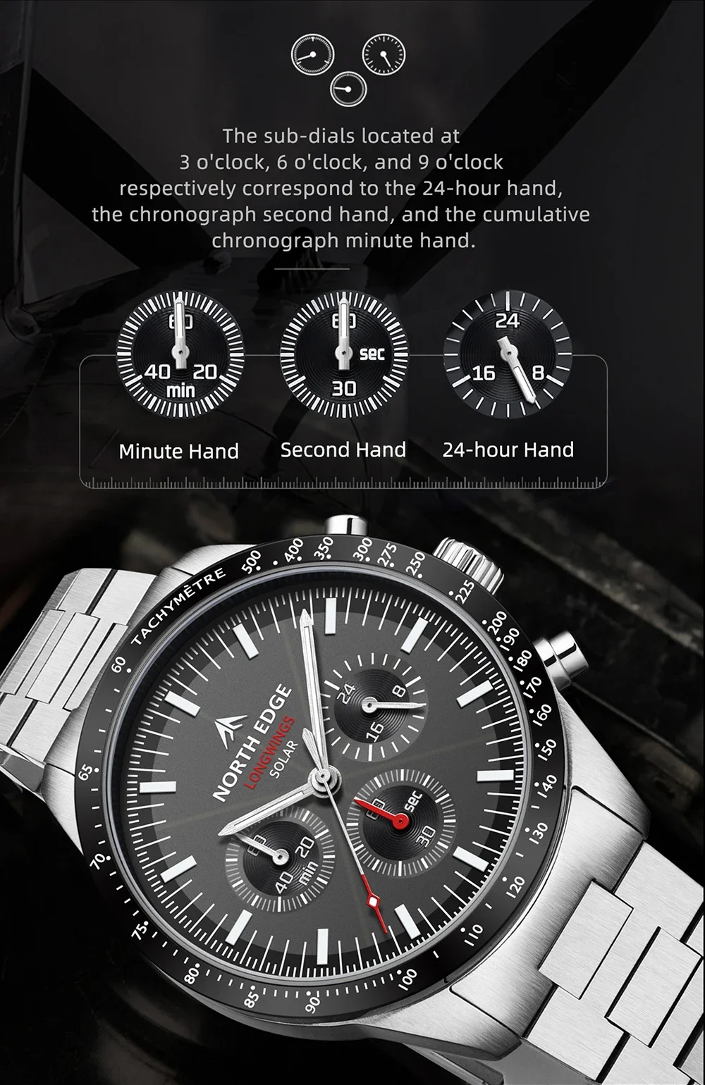 The sub-dials located at 3 o' clock, 6 o' clock, and 9 o' clock respectively correspond to the 24-hour hand, the chronograph second hand, and the cumulative chronograph minute hand.